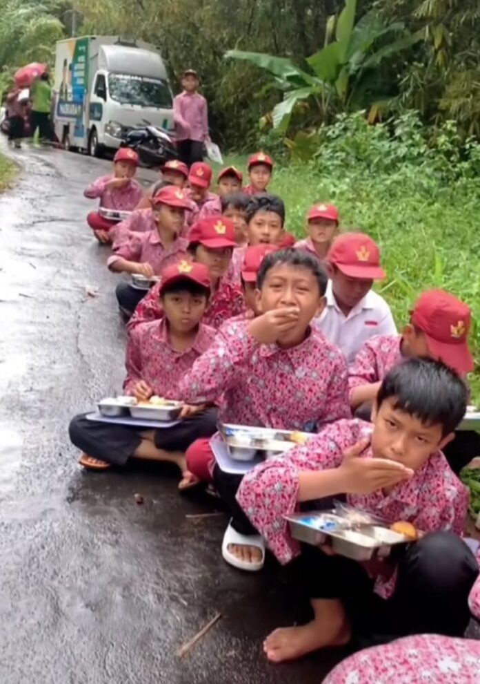 “Akses menuju sekolah sangat susah saat musim hujan dikarenakan jalannya yang begitu engga memungkinkan. Akhirnya anak-anak sekolah menuju ke jalan untuk menerima makanan bergizi gratis dan makan bersama di sana,” tulis caption dalam unggahan tersebut.