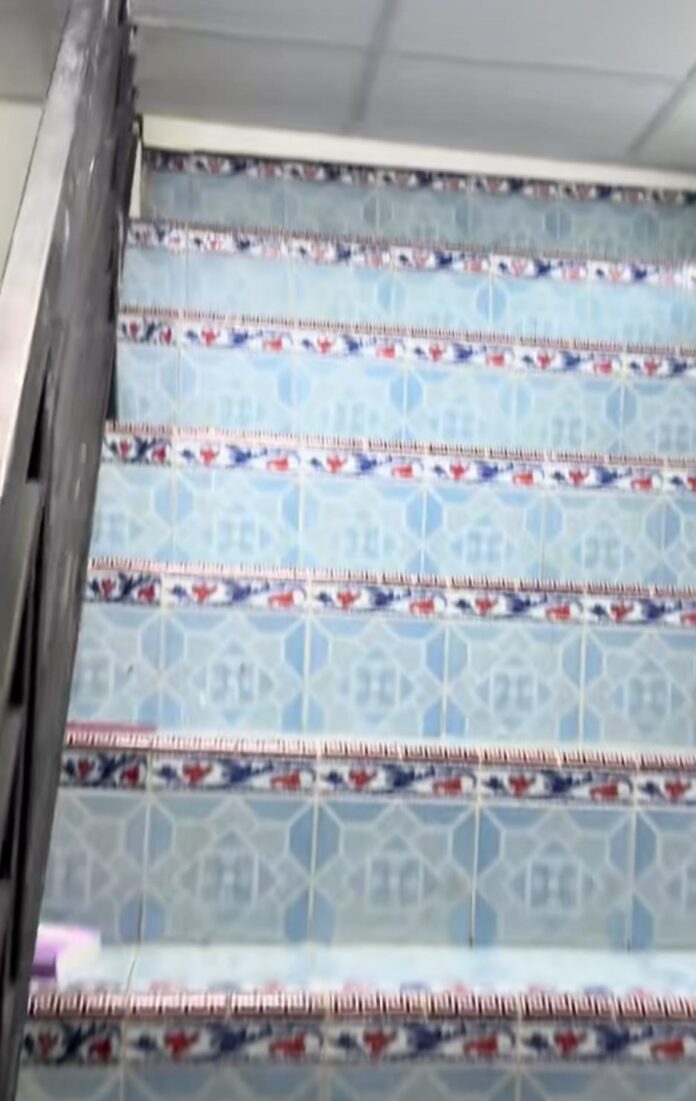 Dirinya pun merekam tangga dengan keramik toilet yang ternyata tidak bisa digunakan. Hal ini karena plafon menuju lantai dua ditutup sehingga tangga tersebut terkesan hanya sebatas interior pemanis.