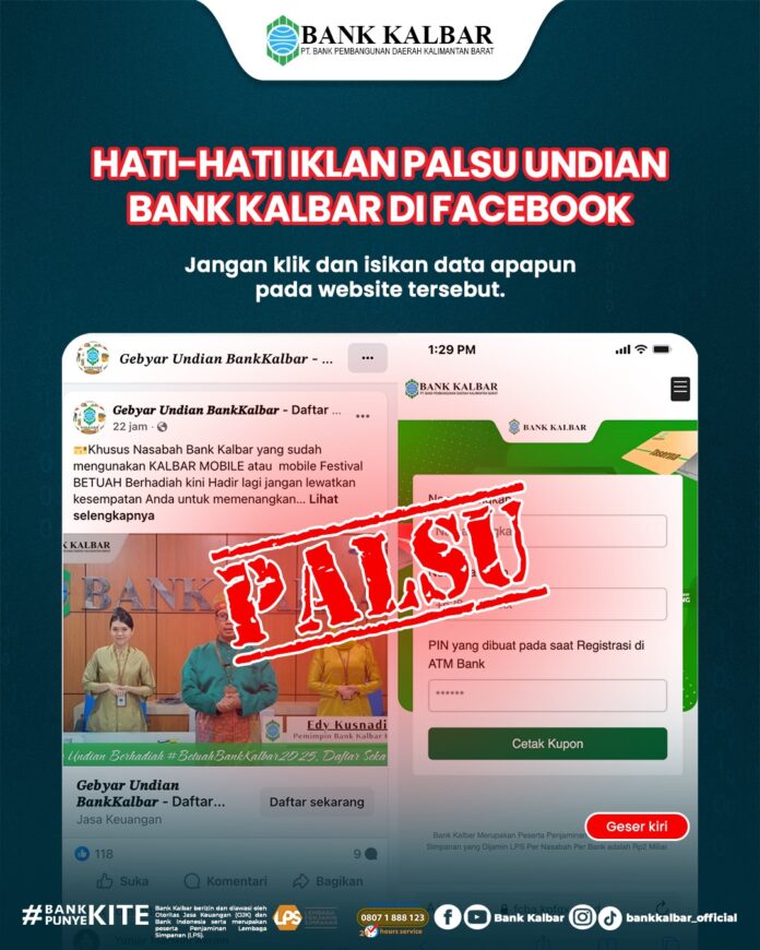 Pontianak Today – Bank Kalbar mengingatkan masyarakat untuk berhati-hati terhadap iklan palsu yang mengatasnamakan undian Bank Kalbar yang saat ini beredar di Facebook. Bank Kalbar menegaskan bahwa setiap informasi undian resmi hanya diumumkan melalui kanal resmi Bank Kalbar, dan masyarakat tidak diperkenankan mengisi data pribadi melalui situs atau link yang mencurigakan.