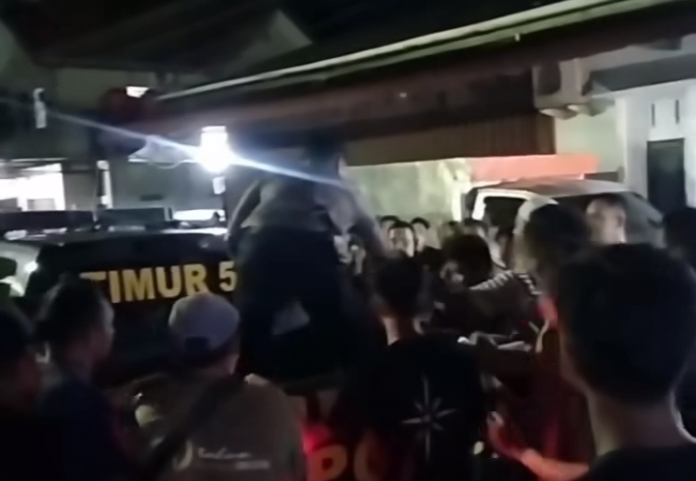 Warga setempat yang melihat berkerumun di sekitar mobil, merasa geram beberapa dari mereka menghujani pukulan kepada remaja yang berada di mobil.