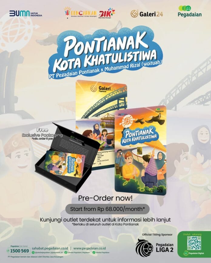 Pada moment Bulan Inklusi Keuangan ini Pegadaian Pontianak meluncurkan emas batangan Galeri 24 edisi khusus “Pontianak Kota Khatulistiwa” berkolaborasi dengan ilustrator lokal Kota Pontianak Muhammad Rizal (@woituah) sebagai salah satu pilihan investasi emas dengan sistem cicilan.