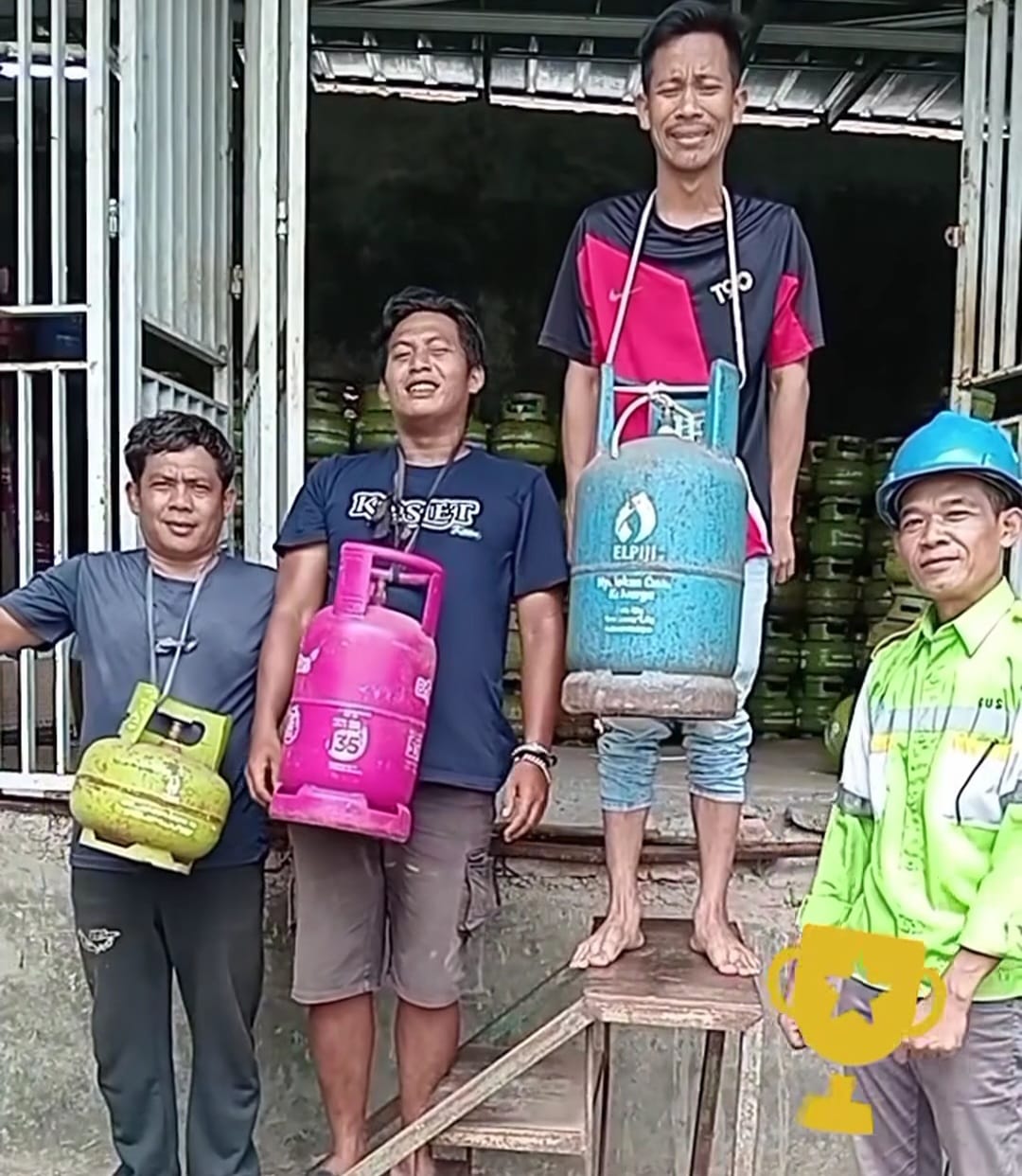 Dalam video tersebut, juara kedua dan juara pertama terlihat keberatan karena harus menahan beban dari bobot tabung gas yang berukuran lebih besar dibandingkan juara ketiga. Hal ini terlihat dari ekspresi atau mimik wajah keduanya usai dikalungkan hadiah yang didapat.