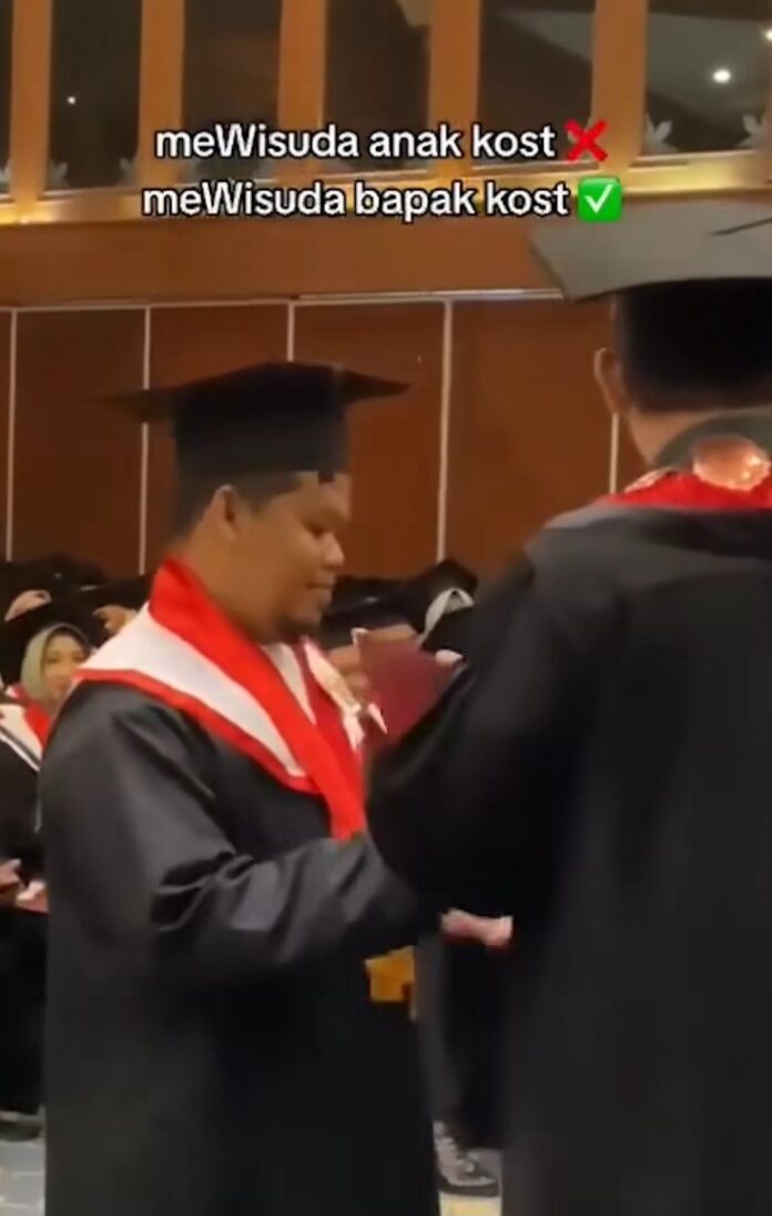 Ketika namanya dipanggil, pria itu berjalan ke panggung dan diberikan map wisuda. Ia kemudian menyalami para pimpinan di hadapannya satu per satu, termasuk sang pengunggah video yang merupakan anak kosnya sendiri.