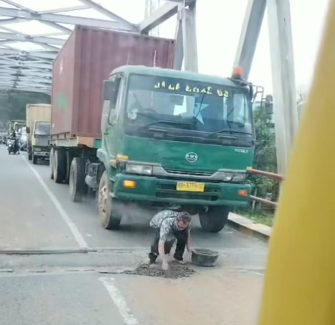 Pontianak Today – Beredar di media sosial, video yang memperlihatkan aksi seorang sopir kontainer berhenti di tengah Jembatan Kuala Ambawang, Kalimantan Barat untuk menambal jalan yang berlubang.