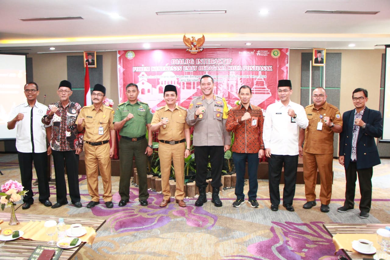 Hi!Pontianak – Pentingnya menumbuhkembangkan nilai-nilai kebersamaan, solidaritas sosial tanpa memandang latar belakang agama, suku, etnis, ras dan golongan, perlu adanya penguatan toleransi dan moderasi beragama. Terlebih menyongsong Pemilu serentak tahun 2024 mendatang. Untuk itu, Forum Kerukunan Umat Beragama (FKUB) Kota Pontianak menggelar dialog interaktif dengan mengangkat tema ‘Memperkuat Toleransi dan Moderasi Beragama, Menyongsong Pemilu Serentak Tahun 2024 yang Beradab dan Bermartabat’ di Hotel Orchardz Perdana, Selasa (18/7/2023).