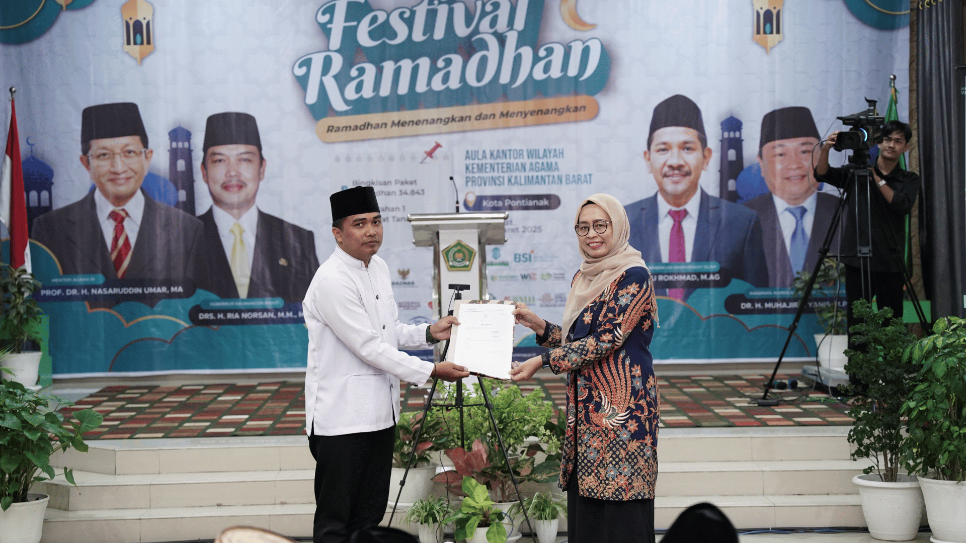 Pada kesempatan ini, Venita menyerahkan sertifikat wakaf milik BWI Kabupaten Kubu Raya. Dalam Festival Ramadan ini, Kanwil Kemenag Kalbar berkolaborasi dengan Direktorat Zakat dan Wakaf Kementerian Agama RI serta Baznas, dan berbagai lembaga amil zakat se-Kalbar untuk mendistribusikan bantuan kepada masyarakat yang membutuhkan.