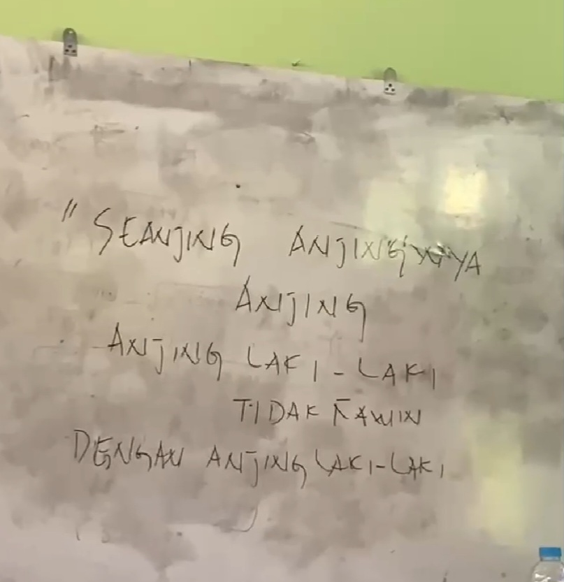 “Seanjing-anjingnya anjing. Anjing laki-laki tidak kawin dengan anjing laki-laki,” tulisnya di papan tulis.