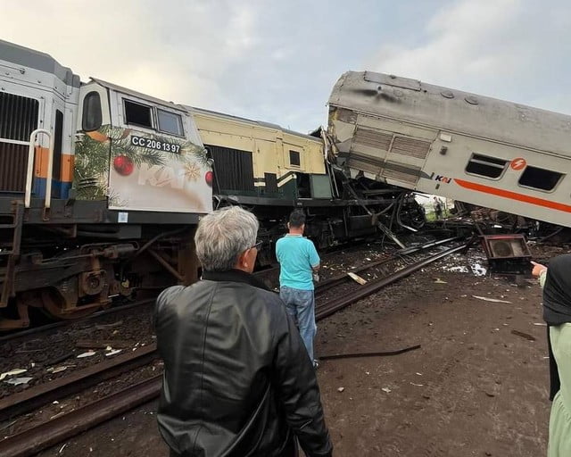 Tampak tiga gerbong kereta anjlok dan delapan gerbong KA Turangga anjlok. Kedua kereta ini ringset dan keluar dari jalur rel.