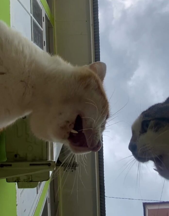 Kedua kucing yang saling berhadapan itu lantas saling beradu raungan secara bersamaan dan bergantian. Mereka saling bertatapan dan meraung cukup lama, entah apa yang diperkelahikan.