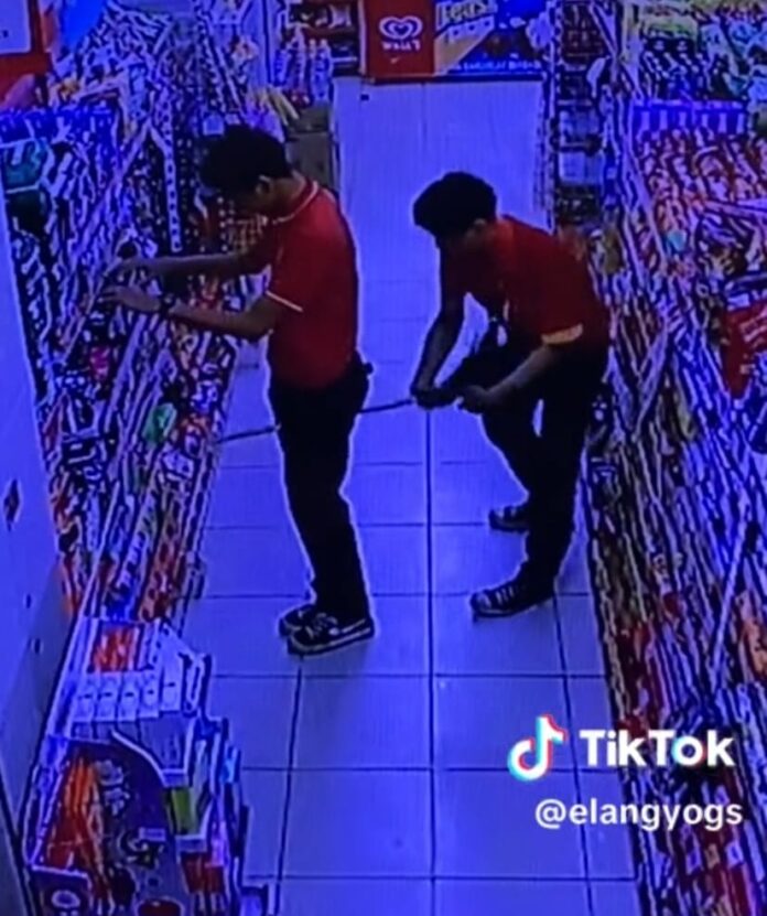 Dalam video yang diunggah akun TikTok @elangyogs, terlihat seorang pegawai pria yang sedang memeriksa dan merapikan persediaan barang di rak-rak. Tak lama kemudian, pegawai pria satunya yang sedang menyapu, datang dari arah belakang untuk menghampiri rekannya.