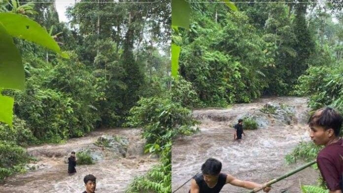 Dalam video yang beredar, air sungai tiba-tiba meluap dan membuat satu pemuda terjebak di tengah derasnya luapan sungai. Khawatir temannya terseret arus, mereka berjibaku mengambil batang bambu sebagai alat bantu menyebrang.