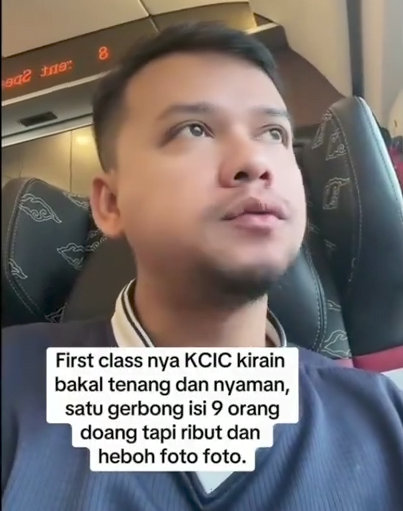 “First class KCIC kirain bakal tenang dan nyaman, satu gerbong isi 9 orang doang tapi ribut dan heboh foto-foto,” tulis pria itu diunggahannya.