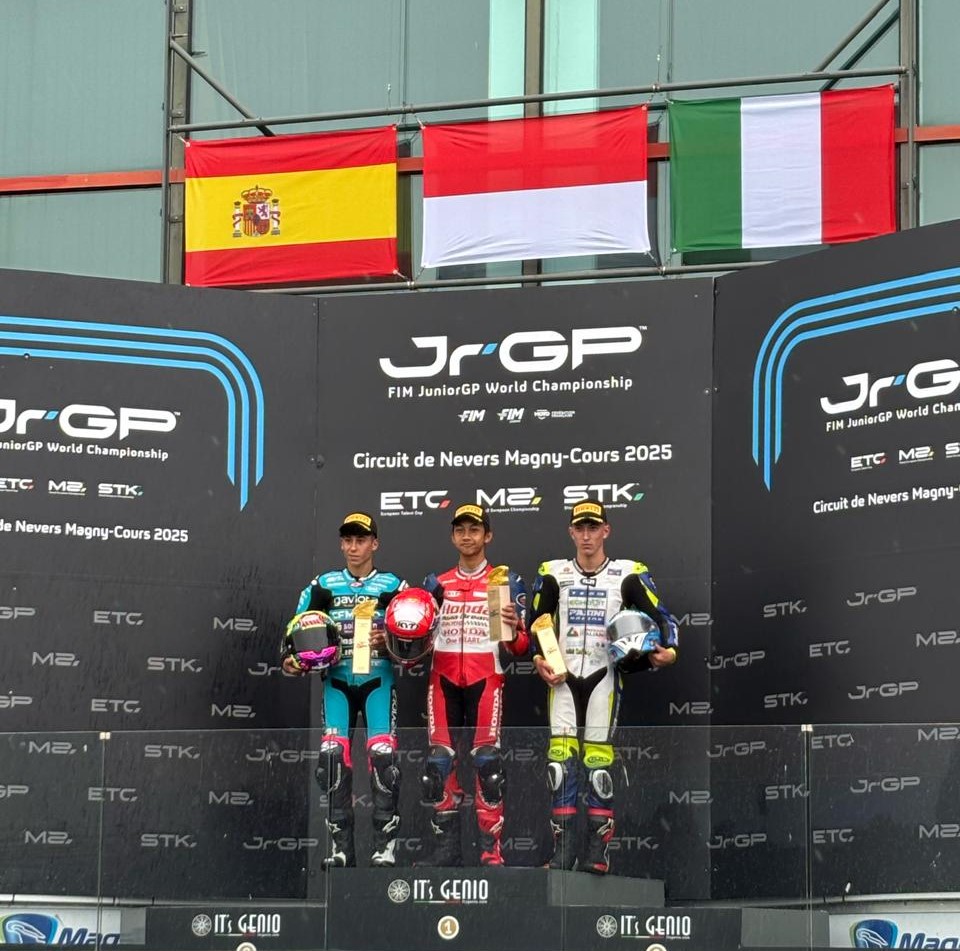 Pontianak Today – Pebalap binaan PT Astra Honda Motor (AHM) kembali cetak sejarah untuk Indonesia. Setelah Veda Ega Pratama menang di RedBull Rookies Cup (RBRC) Italia, kini giliran Muhammad Kiandra Ramadhipa yang tampil memukau dalam gelaran FIM JuniorGP World Championship yang berlangsung di sirkuit Magny-Cours, Prancis pada 5-6 Juli 2025.