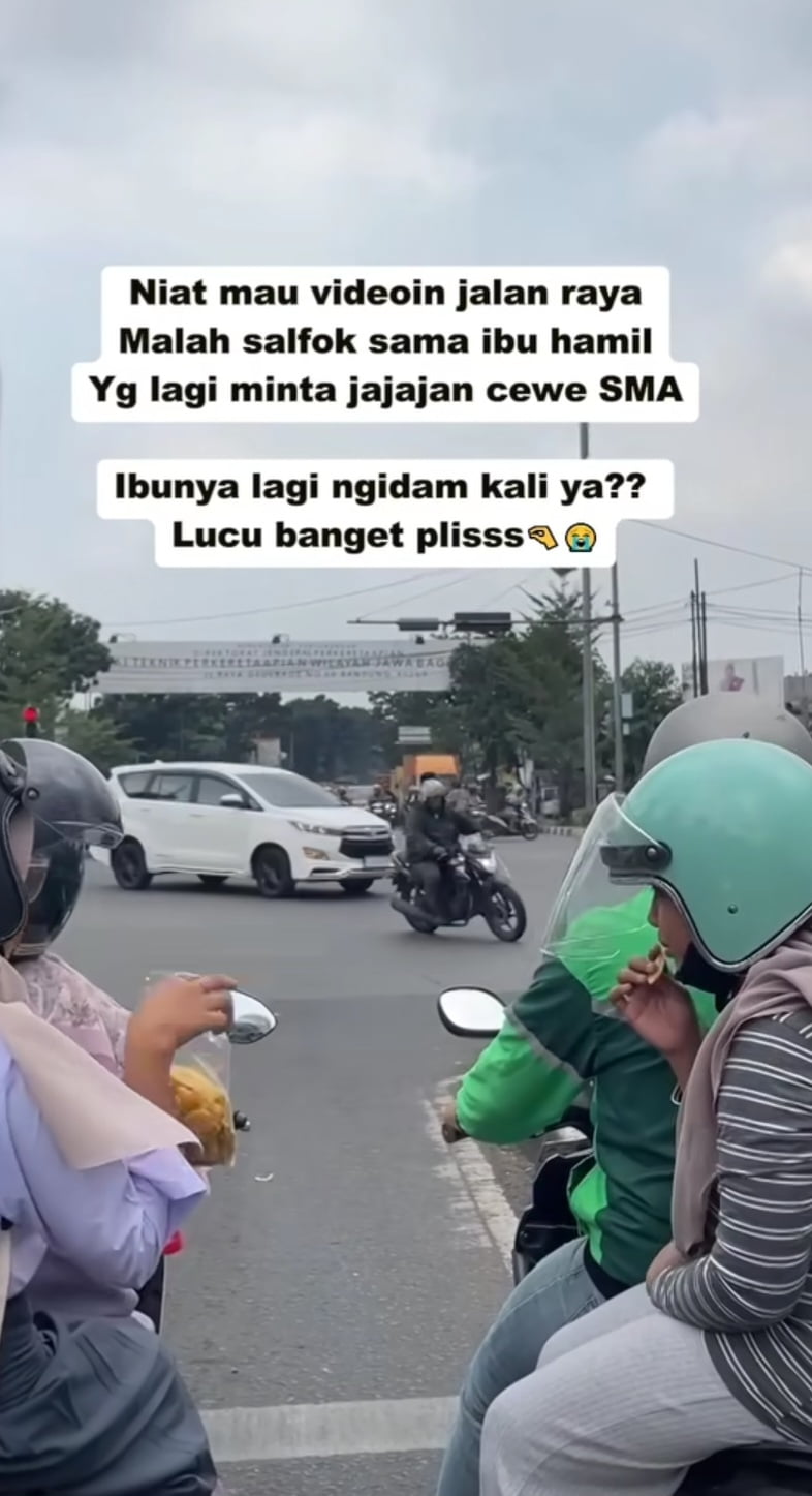 Dalam video tersebut, tampak ibu hamil yang dibonceng ojek online (ojol) itu tergoda dengan jajanan yang dimakan oleh pengendara di sebelah kirinya. Ia kemudian mencoleknya sebagai kode untuk meminta jajanan berupa keripik tersebut.