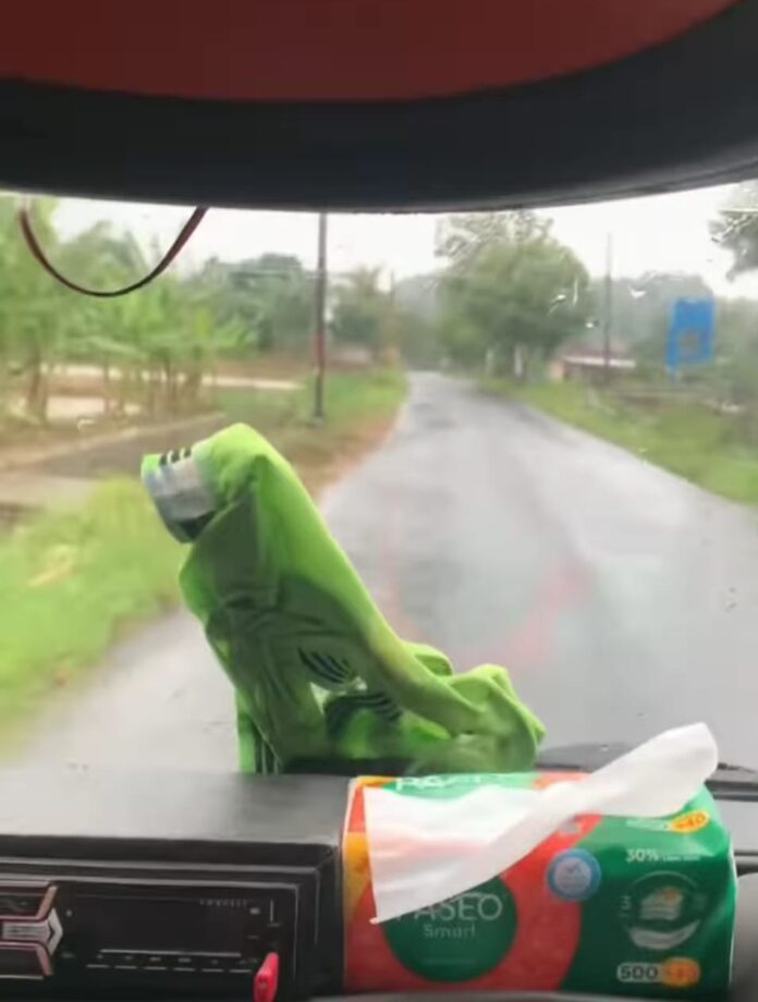 Dalam video tersebut, tampak sebuah celana dalam berwarna hijau nyasar dan mendarat di bagian kaca depan mobil. Celana dalam tersebut pun otomatis berguna menjadi pengelap gratis yang dibantu oleh wiper mobil.