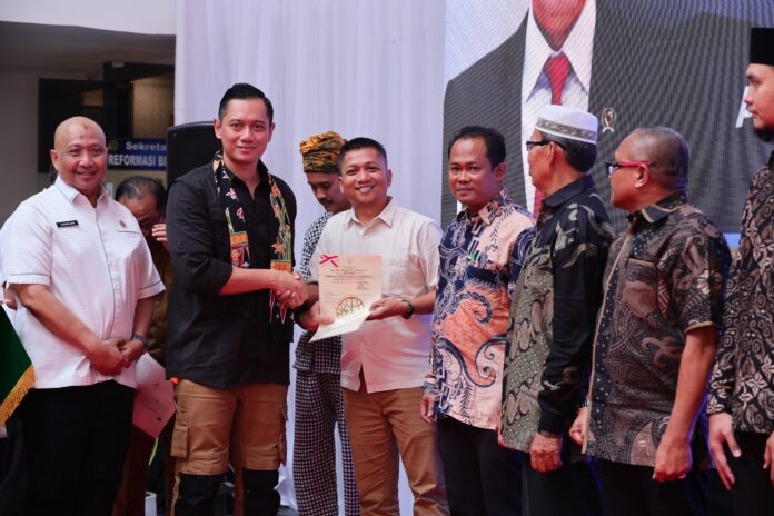 Pontianak Today – Menteri Agraria dan Tata Ruang/Kepala Badan Pertanahan Nasional (ATR/BPN), Agus Harimurti Yudhoyono (AHY) menyerahkan secara simbolis 12 Sertifikat Tanah Elektronik di Kantor Pertanahan (Kantah) Kota Bekasi, Provinsi Jawa Barat, Selasa, 6 Agustus 2024. Ia menyebut bahwa kesuksesan layanan pertanahan merupakan hasil kerja sama dan kolaborasi yang baik antara Kantah dan Pemerintah Kota Bekasi.