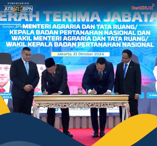 Pontianak Today – Kementerian Agraria dan Tata Ruang/Badan Pertanahan Nasional (ATR/BPN) menyelenggarakan Serah Terima Jabatan (Sertijab) Menteri ATR/Kepala BPN dan Wakil Menteri ATR/Wakil Kepala BPN di Aula Prona Kementerian ATR/BPN pada Senin (21/10/2024). Menteri ATR/Kepala BPN, Nusron Wahid mengaku akan melanjutkan hal-hal yang telah dirintis oleh pemimpin-pemimpin sebelumnya di Kementerian ATR/BPN.
