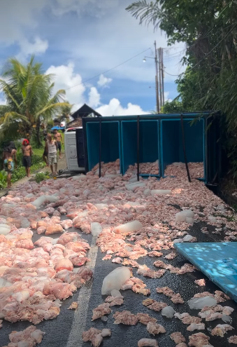 Peristiwa itu diketahui melalui unggahan akun Instagram @gustufd yang memperlihatkan kondisi di lokasi kejadian. Dalam rekaman tersebut, potongan daging ayam tampak tercecer di sepanjang jalan, sementara sebuah kendaraan terlihat melintang di tengah ruas jalan.
